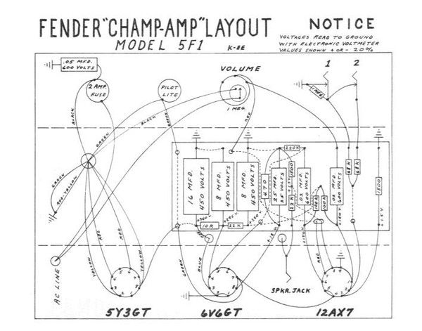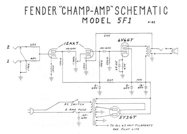 Being particularly fond of the class A configuration of the Fender Champ-Amp, I took its original schematic one step further adding a passive tone-control circuit.